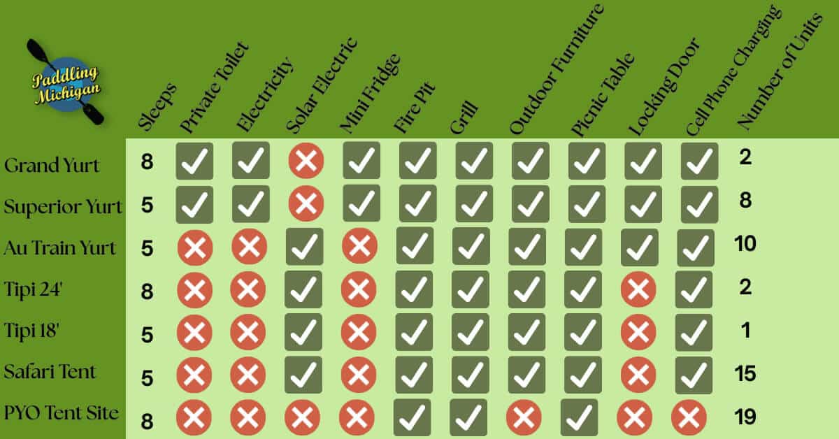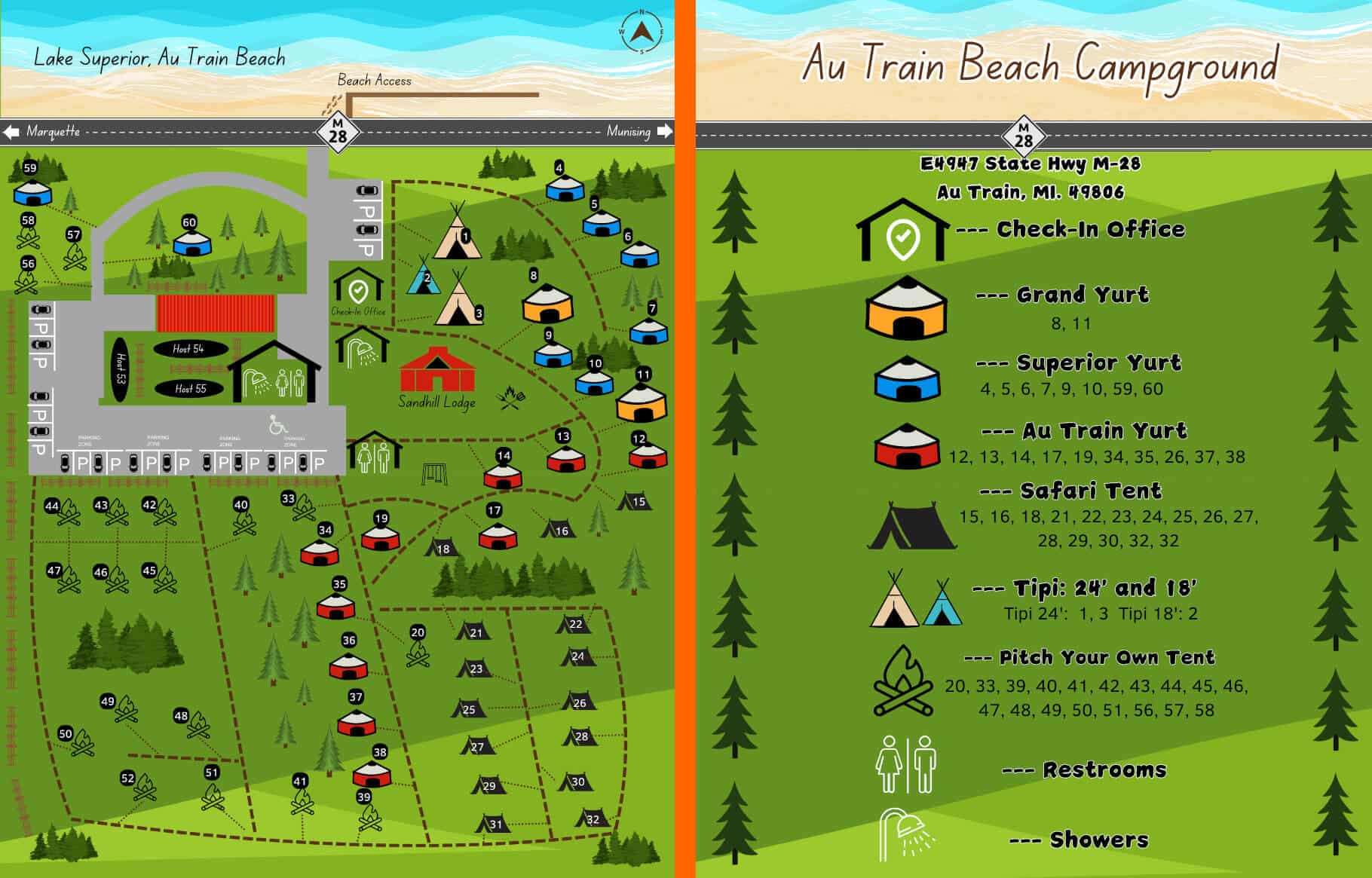 We have 13 pitch-your-own-tent (PYOT) rustic campsites (walk-in access only), 15 furnished safari tents, 23 furnished Yurts, two grand yurts, and three furnished mini-tipis! All sites have firepits, outdoor charcoal grills, and a picnic table. All of our Hiawatha National Forest yurts, safari tents, and tipis are on wood platforms with solar lighting inside. The grand yurts have full electricity and mini fridges! All of our sites at the Au Train Beach campground are walk-in access only with just a short walk from the parking area (utility wagons are available for your gear). Wi-Fi is available in a common area at the campground.